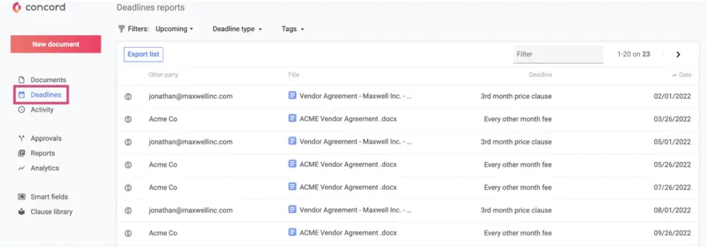 A contract management tool saves you from having to do this over and over again — and it enables you to view and filter large numbers of contracts by upcoming deadlines, too.