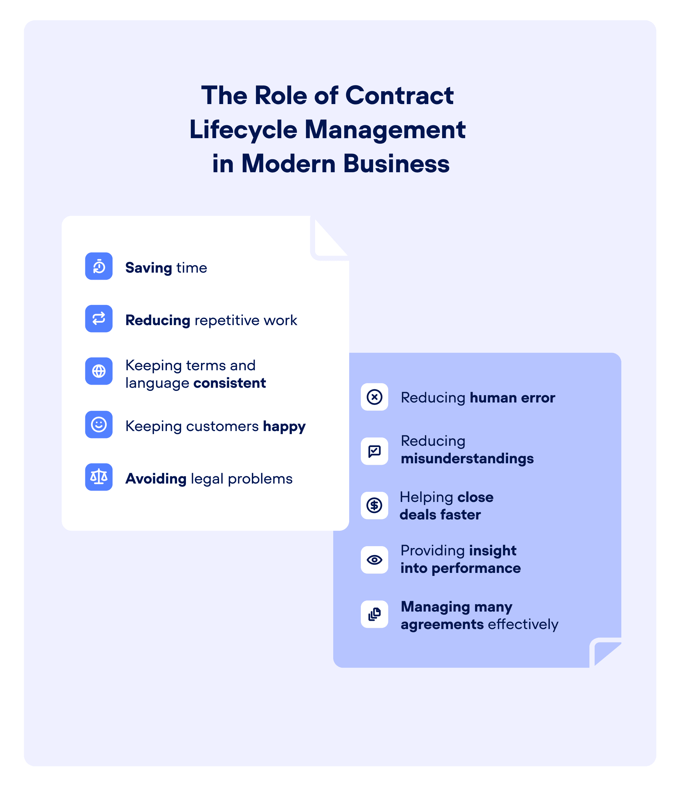 Contract management saves legal teams time, and helps free them up from low-value work. For example, a comprehensive approach to CLM can help legal experts anticipate challenges like compliance issues, missed deadlines, upcoming renewal or cancellation dates, and breaches of contract. But with clear contract-facing roles and processes, even a relatively lean legal team can manage thousands of agreements efficiently.